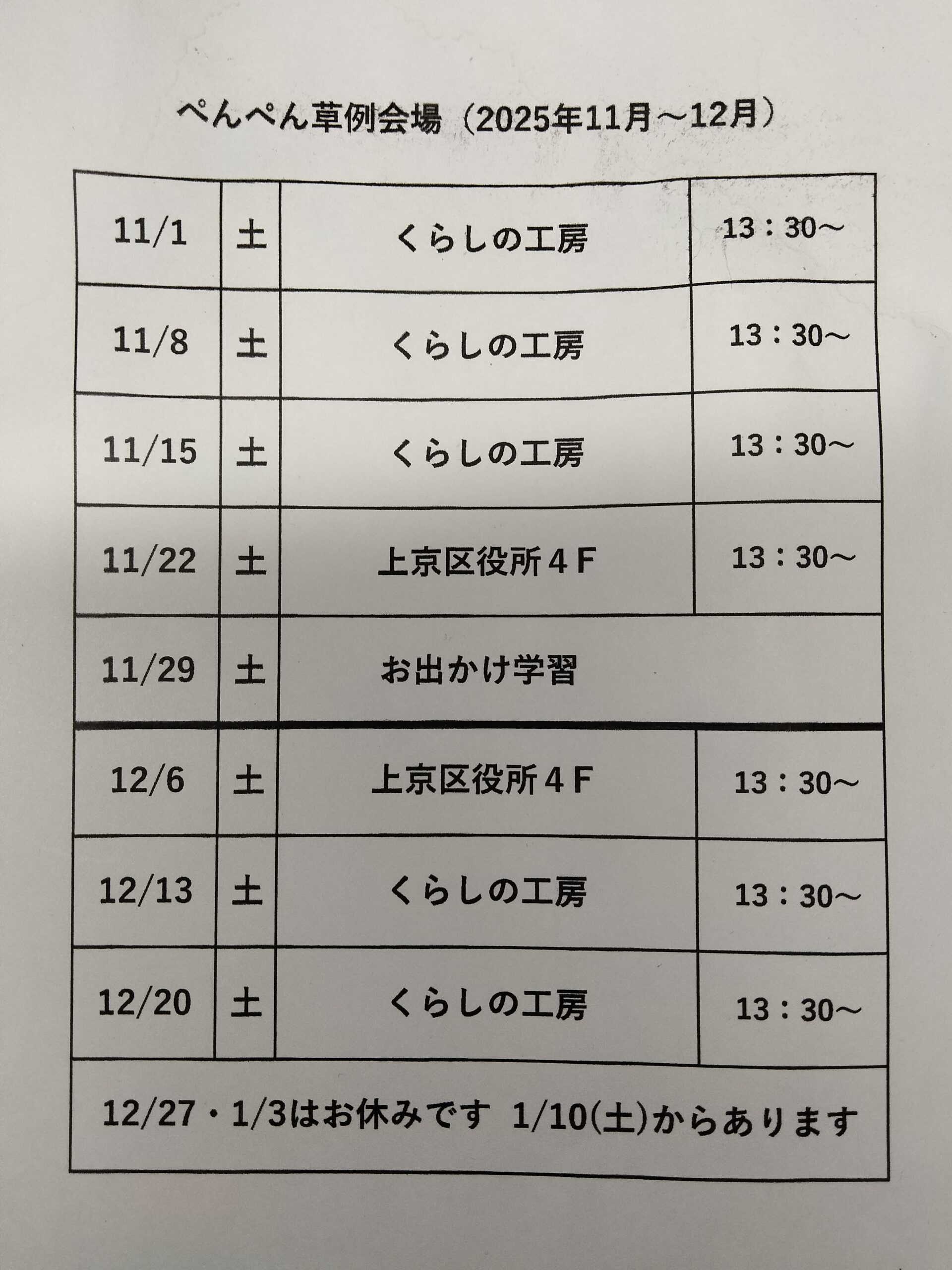 | 上京支部(昼の部) ぺんぺん草 | 11月12月の例会場は次の通りです。 ここをクリック🖱 11月29日はお出かけ学習が変更になり、暮らしの工房で例会をします。 | |